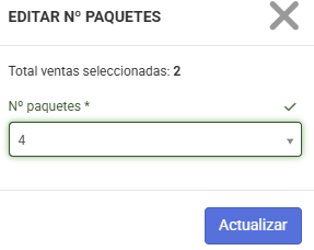 - De forma masiva, seleccionando las ventas en cuestión y haciendo click en el botón general de Acciones > Editar nº de paquetes. Con esta opción actualizarás el número de paquetes de cada venta, para así después generar el envío con los paquetes ya preestablecidos