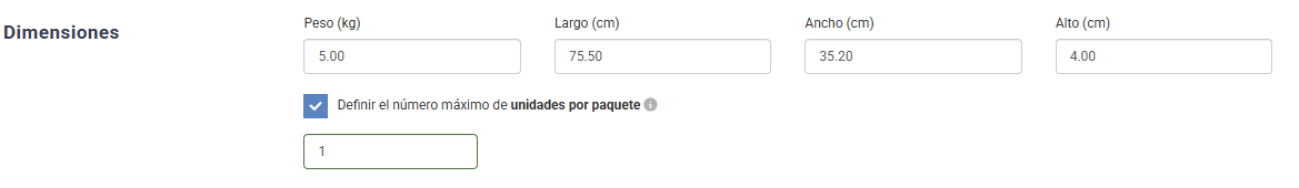 Una vez aquí, debes marcar la opción "Definir el número máximo de unidades por paquete", e indicar las unidades máximas del artículo que caben en un bulto.